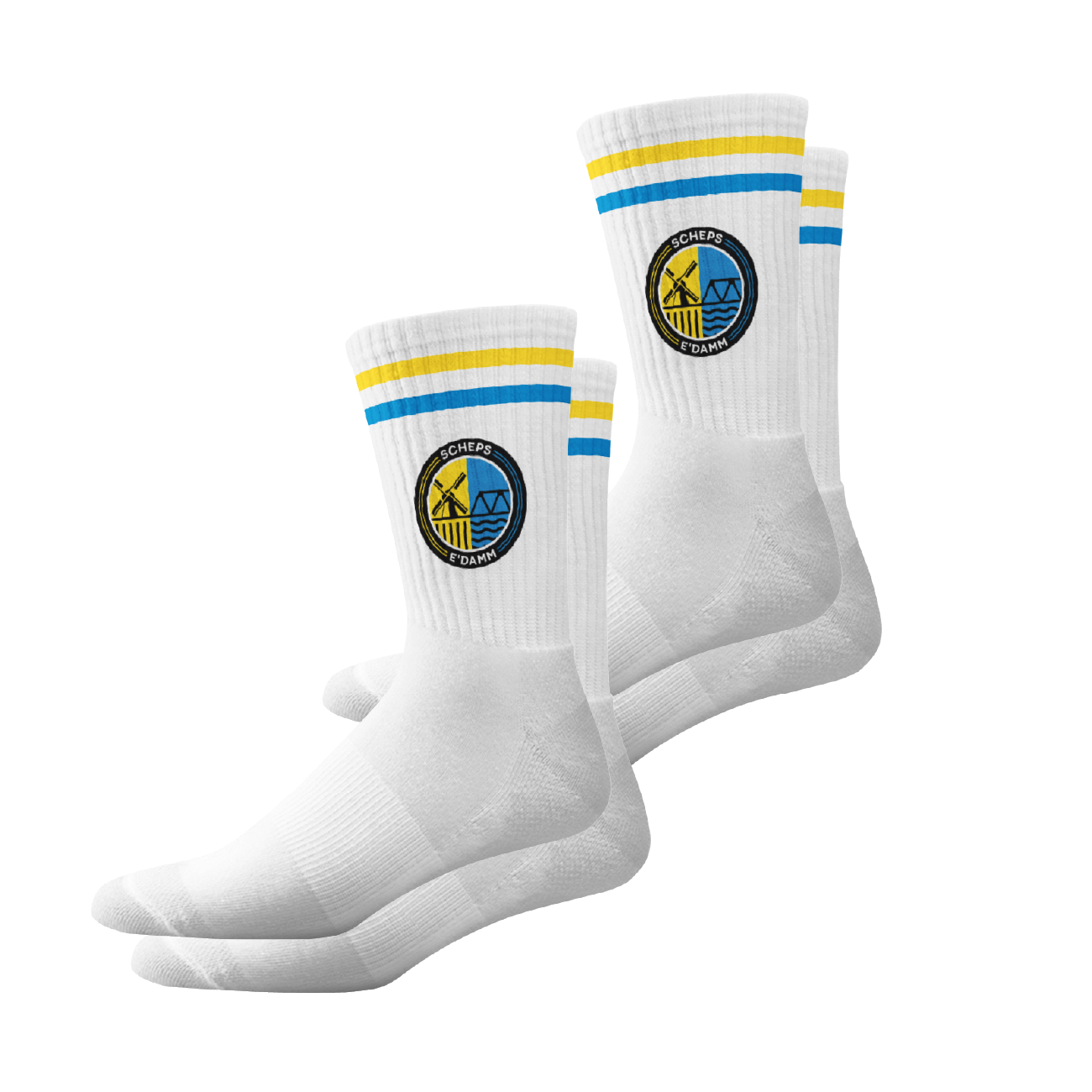 Weiße Sportsocken aus Baumwolle-Elasthan-Mix (80 % / 20 %), mit gelbem und blauem Streifen und eingewebtem SGSE-Wappen. Erhältlich in mehreren Größen. Set aus zwei Paaren. Produziert in Polen.