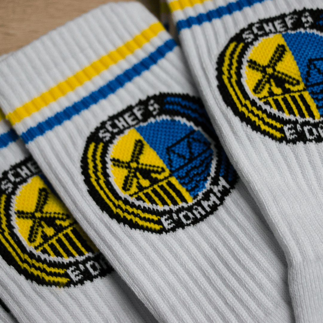 Weiße Sportsocken aus Baumwolle-Elasthan-Mix (80 % / 20 %), mit gelbem und blauem Streifen und eingewebtem SGSE-Wappen. Erhältlich in mehreren Größen. Set aus zwei Paaren. Produziert in Polen.