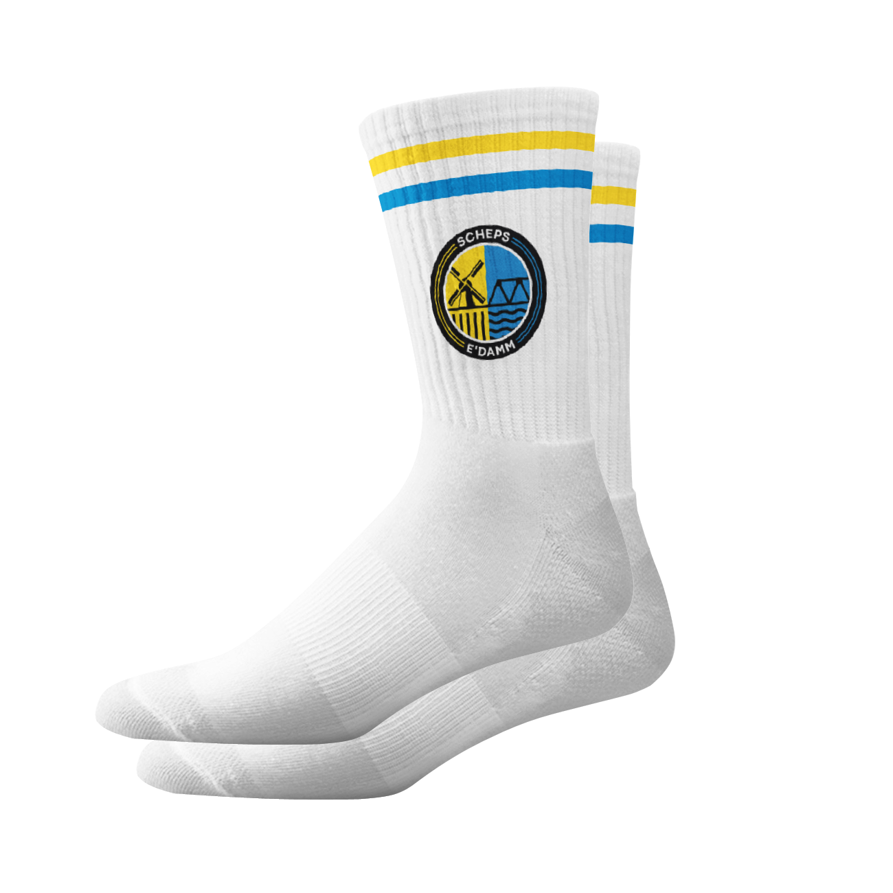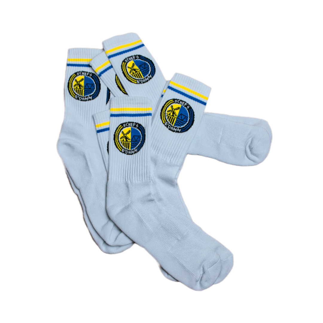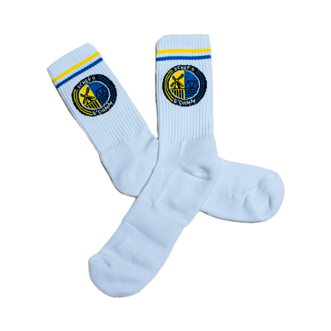Weiße Sportsocken aus Baumwoll-Mix, mit gelbem und blauem Streifen und eingewebtem SGSE-Wappen. 2er-Pack. Produziert in Polen.